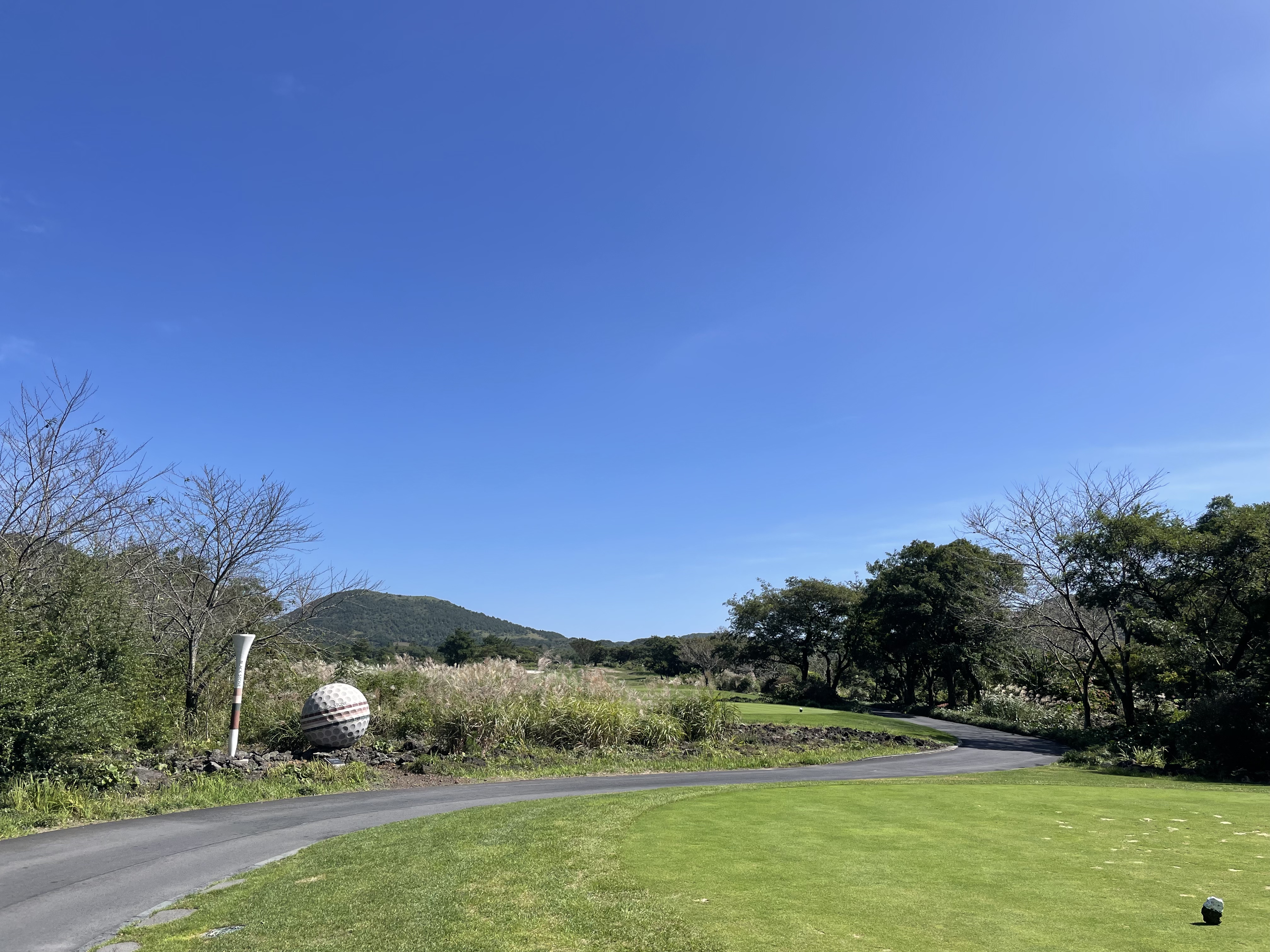 핀크스는 먼 바다가 보일 정도로 뚫려 있는 풍광이라면 블랙스톤은 편평한 숲속에 있는 자리한 느낌으로 아늑한 느낌을 준다. 동-북 코스를 돌았는데 란딩하는 내내 오르막을 오른 기억이 없을 정도로 이곳은 걸으면서 란딩하기에는 참 좋은 골프장. 첫 티박스로 가니 블랙스톤 제주를 검색하면 후기들 사진에서 많이 봤던 골프공과 티 조형물이 보인다.