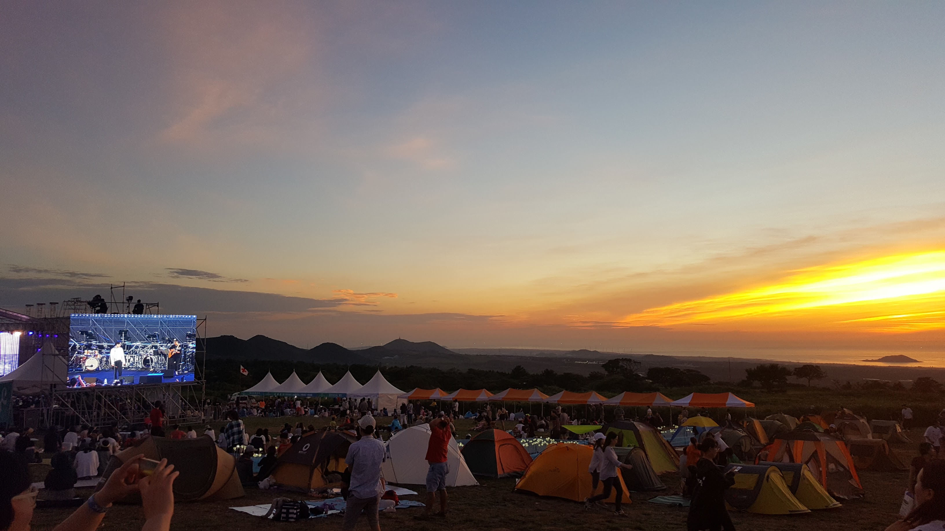 그런데, 막상 도착하니 한여름의 애월 선셋과 맞물려 이게 한국의 우드스탁? 이라는 생각이 들 정도로 넓은 자연 마당에 젊은이들, 아이가 있는 가족들 남녀노소 상관 없이 콘서트를 즐기고 있었다. 실제로는 사진으로 담기 힘든 너무 멋진 풍광이었는데 아마추어 직장인 밴드를 했었던 나로서는 이런 곳에서 공연을 할 수 있다면... 버킷리스트에 담아 한번은 해 보고 싶다는 생각이 들 정도였다.