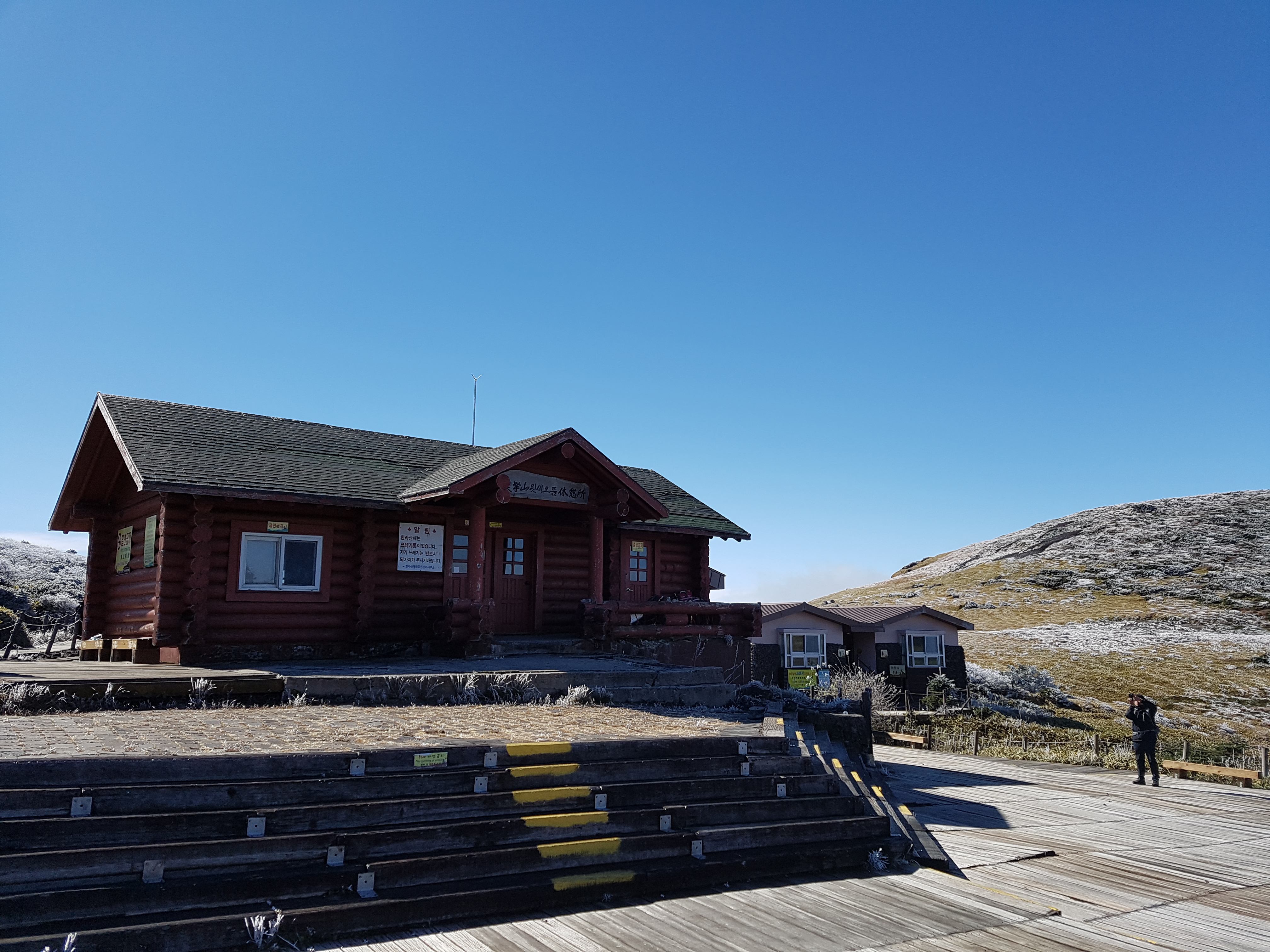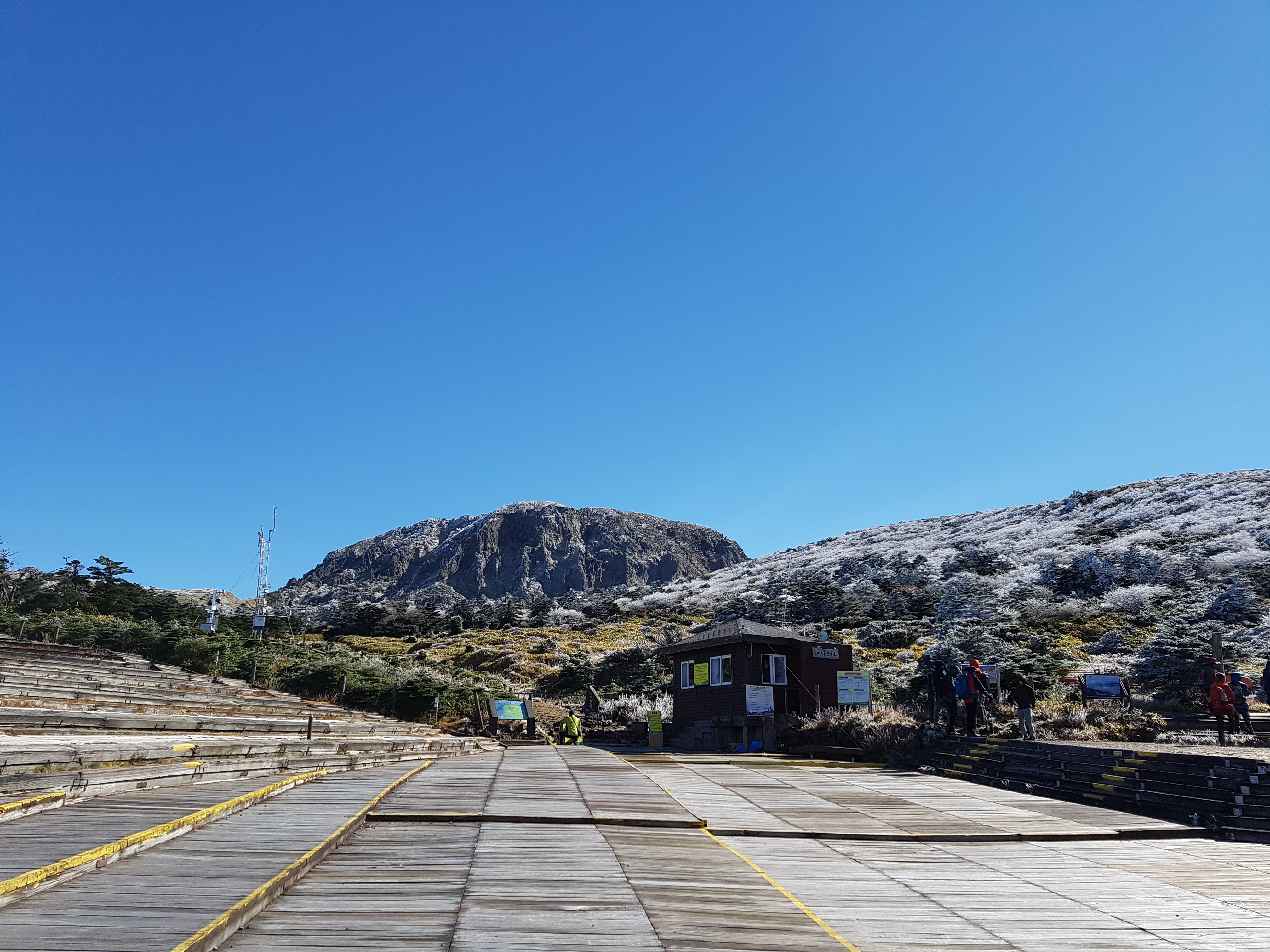 그렇게도 바람이 강했었는데 신기하게도 휴게소 부근은 구름도 걷히고 바람도 없고 심지어 따뜻하기까지 했다. 휴게소까지 올라오면 백록담 봉오리를 아주 가까이서 볼 수 있다. 다만, 아쉽게도 여기까지 올라왔지만 영실 코스에서는 백록담까지는 이어지지 않는다. 초입부에 얘기한대로 백록담을 보려면 성판악으로 가야한다.