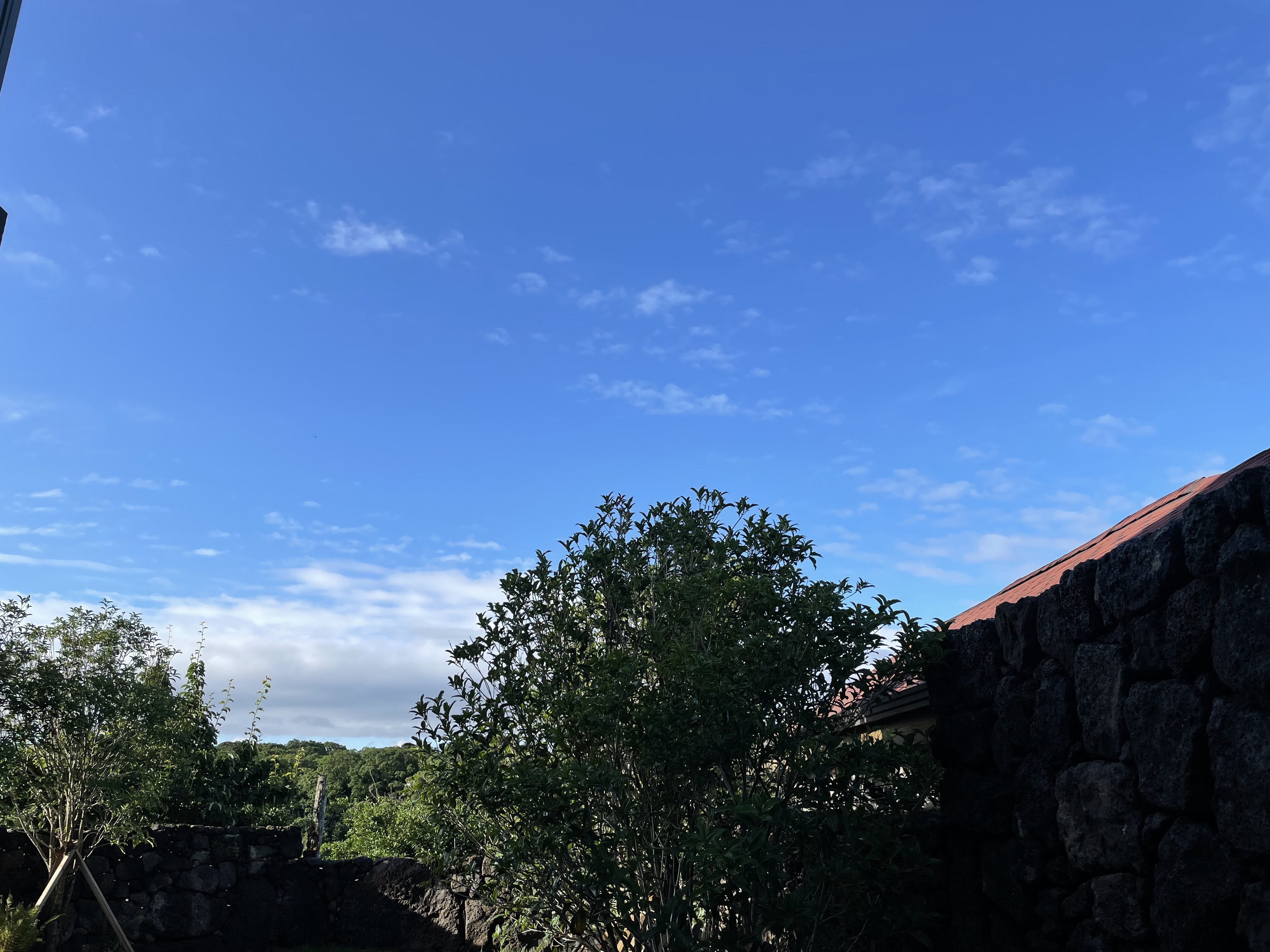 친구들과 수다 떨고 노형동에서 사온 회와 와인도 한잔.... 뿐만 아니라 소맥에 소주 맥주 풀코스를 달리다보니 기절해 있었다. 그래도 지금 나이에서는 아침 7시면 눈이 떠진다. 점점 더 일찍 떠지겠지... 아침에 일어나니 귀여운 새소리가 아침을 맞이해주고 있었는데 뒷마당을 나가보았다. 어제는 비도 오고 하늘이 우중충했는데 오늘은 날이 좋구나! 하늘이 파랗다!