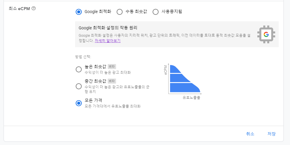 각각의 광고의 최소 eCPM 은 최대한 노출 위주로 설정했다. 이유는 비싼 광고가 나오도록 우선순위를 설정해두면 광고가 안나오는 경우가 있어서 기능적인 면에 영향이 있다고 판단했기 때문.