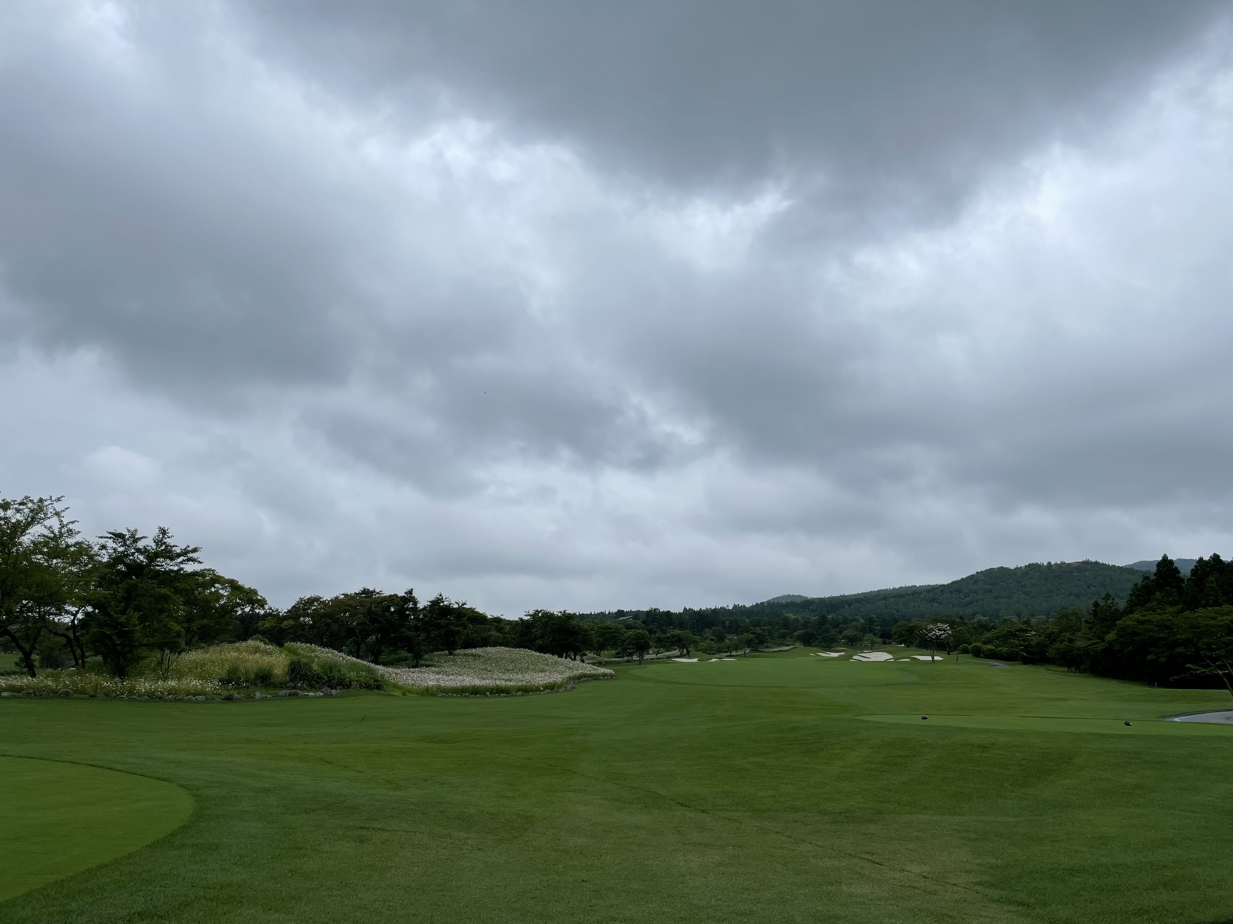 8번홀에서 만신창이가 되었는데 허허 웃어버리고 동코스 마지막 par-5 홀에 도착했다. 없던 화단이 생겼다. 코스모스를 심었다고 했던 것 같다. 여튼, 동코스 마지막 par-5 홀은 넓다. 부담없이 티샷을 날릴 수 있고 세컨샷도 부담을 주지 않는 홀. 위기는 그린 공략에서 온다. 그린이 높은 언덕 위에 있는데 그린이 넓지 않은데다 주변이 벙커 밭이다. 그린이 넓지 않기 때문에 벙커에 빠지면 소위 볶음밥을 만들 수 있는데 벙커에서 탈출했더니 그린을 넘어 데구르르 맞은 편 벙커에 빠지는 것. 다행히 이 날은 누구도 볶음밥을 만들지 않았다. 나도 써드샷이 가까스로 그린 앞 턱을 맞고 엣지에 걸려 있었다! 조금이라도 짧았으면 벙커에 박힐 뻔했으니 말이다.