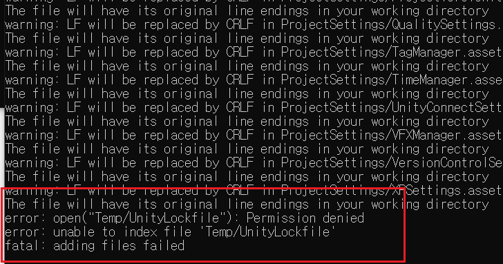 로컬에서 git add . 실행 시 발생한 에러로 Temp/UnityLockfile 에 대한 권한이 없다는 에러인데 해결방법은 간단했다. 열려 있는 유니티 에디터를 닫아주면 된다. ^0^