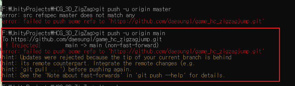 원인을 찾아보니 git 에서 데이터 유실 염려가 있어서 띄우는 오류라고 한다. git pull 을 해봐도 오류가 해결되지 않아서 임시 방편으로 강제 푸쉬로 해결했다.