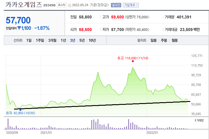이런 상황에서 카겜이 엄청 욕먹었던 이슈로 오딘 개발사 상장은 더블카운팅 우려가 있다. 따라서 혹독하지만 요즘 같은 시장 분위기에서는 오딘 런칭 전의 가격이 시장에서 평가 받는 적정가로 보였다. 당시 50,000 ~ 55,000 원 횡보, 그럼 지금이 딱 그 정도 가격!