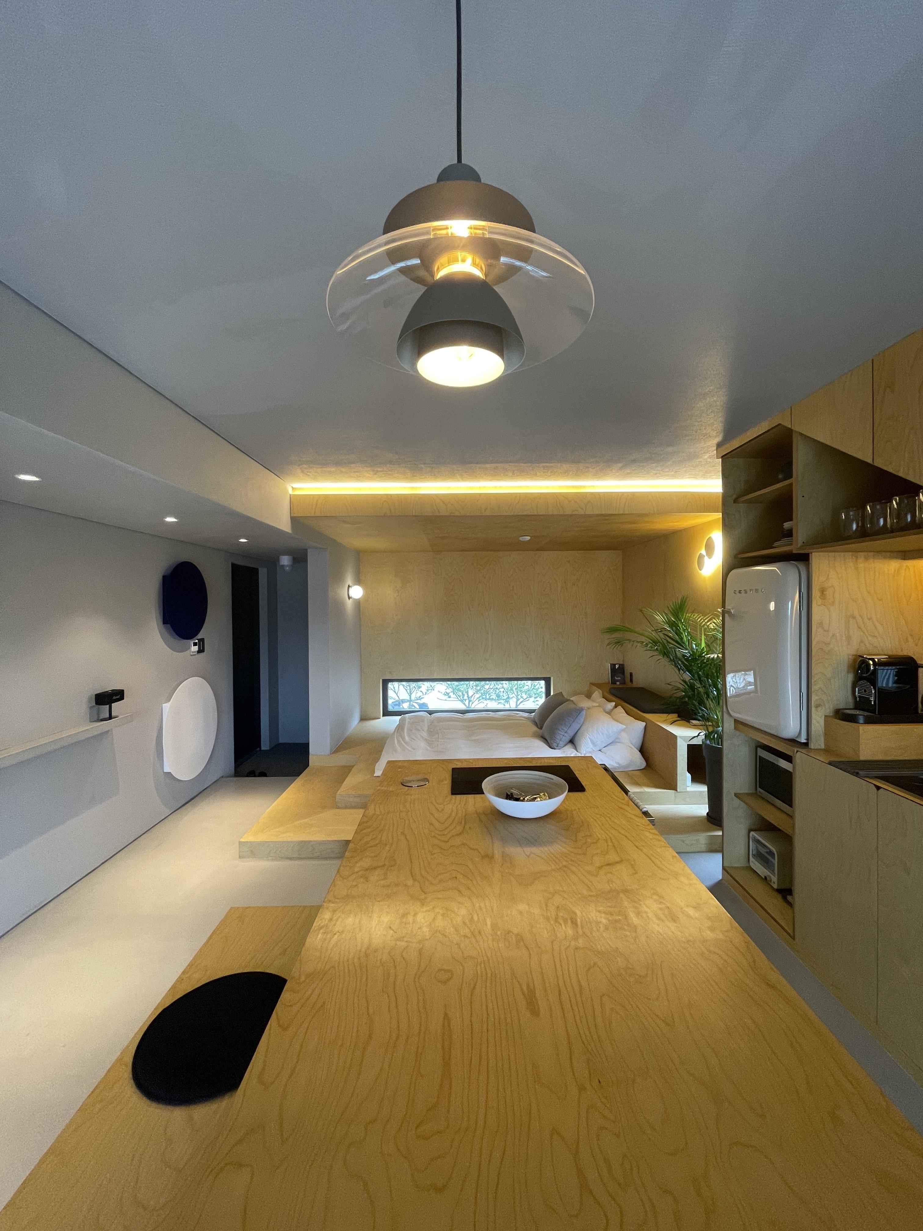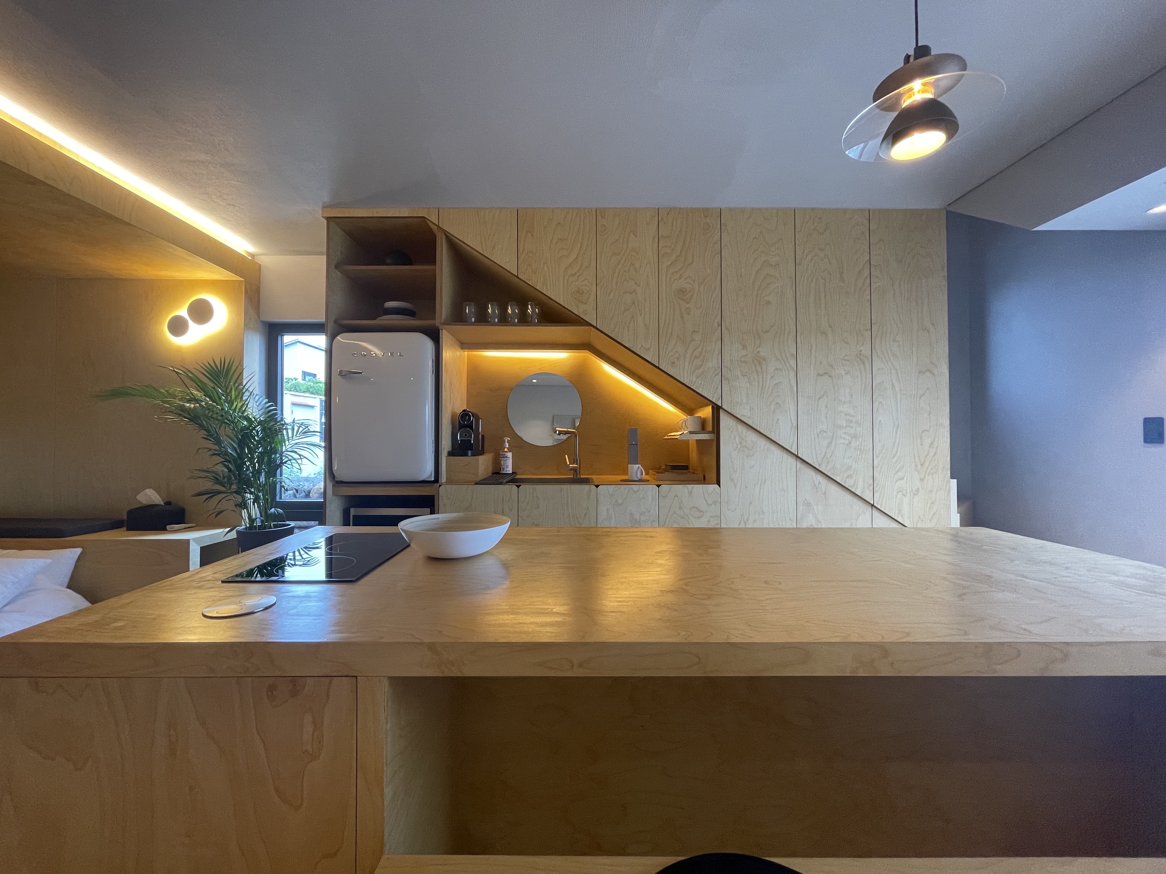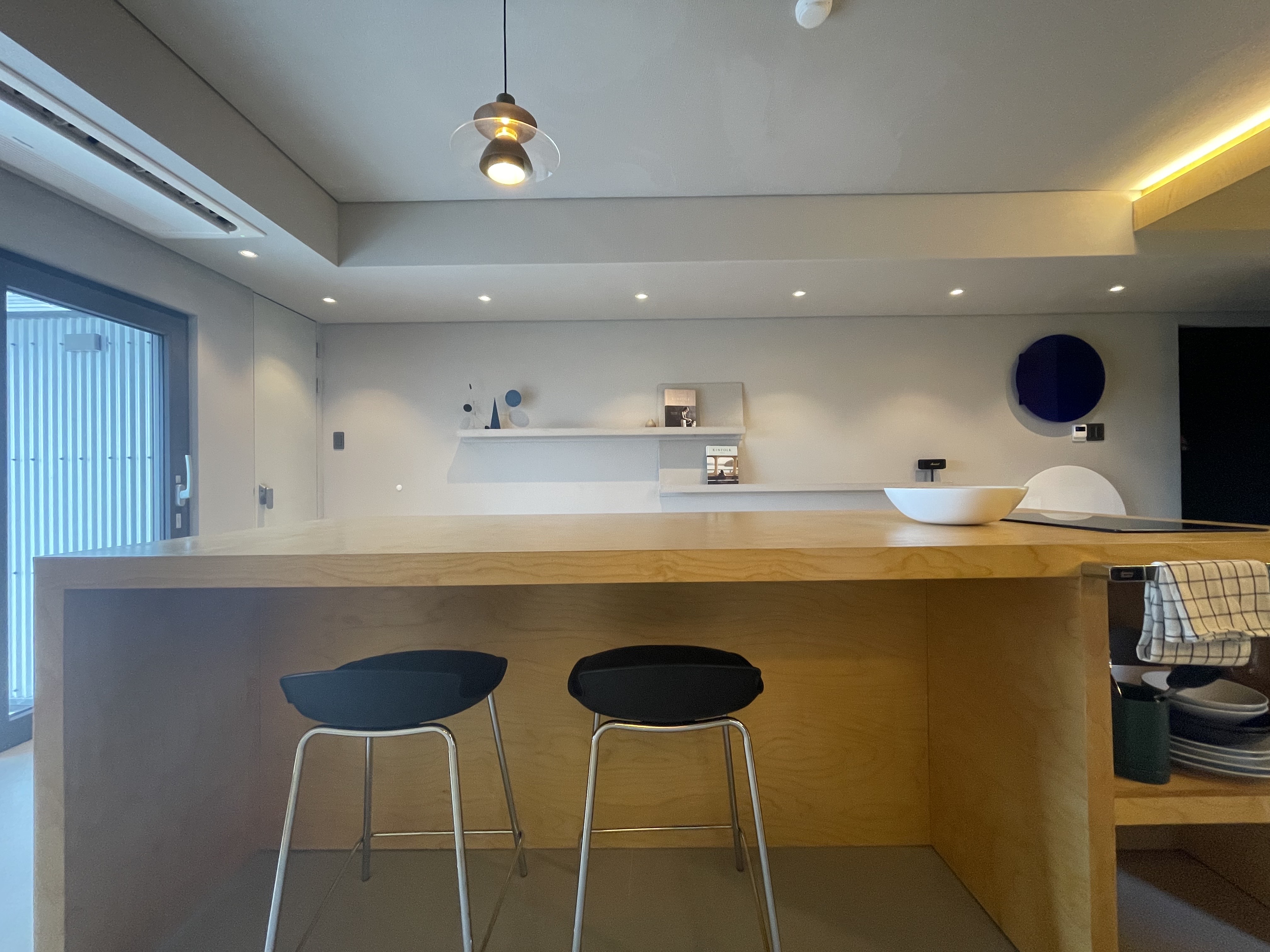 간단한 조리를 할 수 있는 아일랜드바가 있는데 상판에 인덕션과 2구짜리 콘센트가 심어져 있다. 뒤편에는 싱크대가 있고 냉장고, 전자레인지, 토스트기, 식기등이 있어서 가족, 친구들과 사온 음식을 조리해서 한잔 할 수 있는 공간. 고민고민하다 시야를 가리게 되어서 후드 설치를 안해서 고기, 생선 구이 같은 냄새가 강한 조리는 불가 방침. 아쉽지만 공유하는 공간이니 어쩔 수 없을 것 같다.