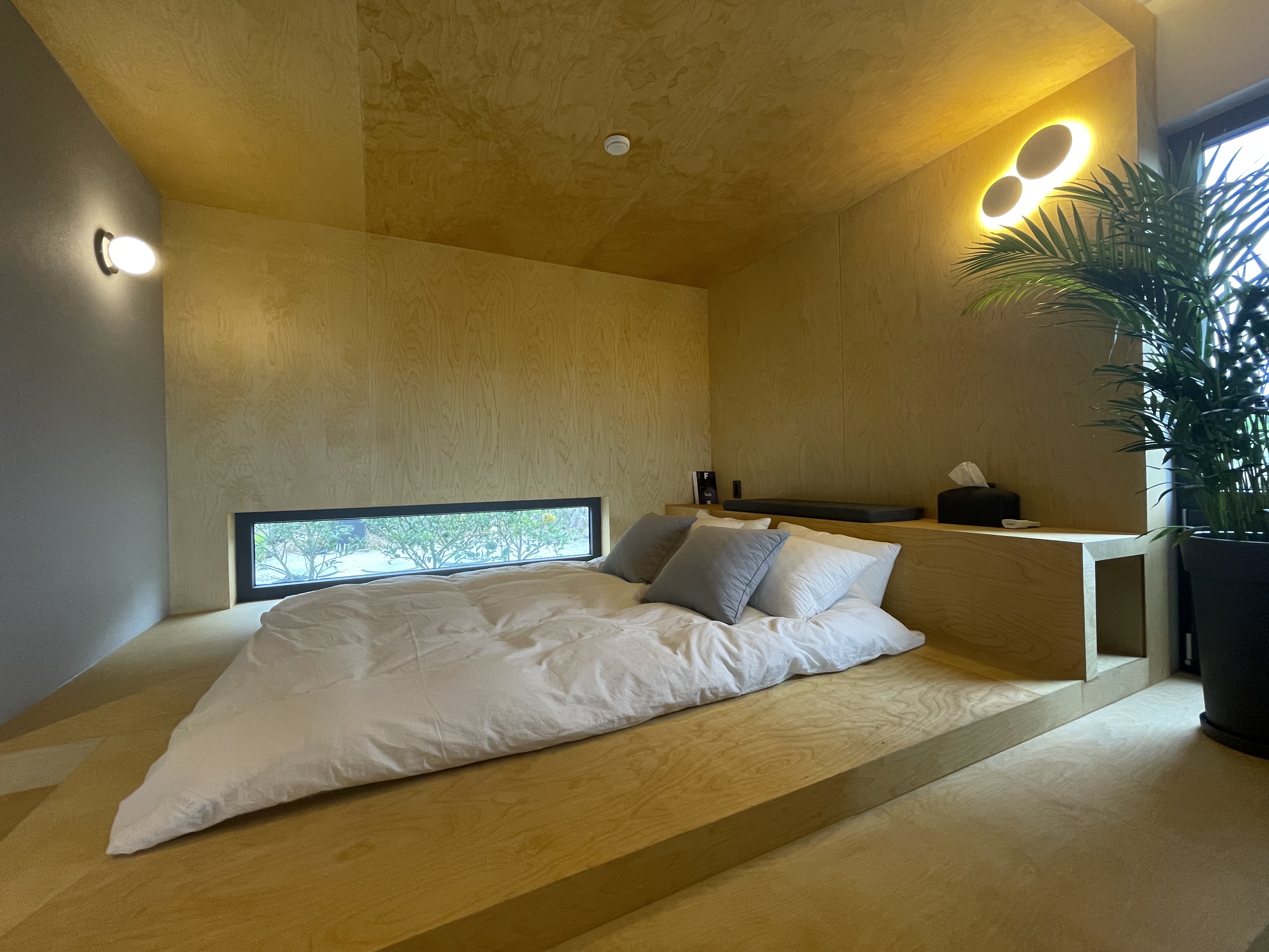 객실 'ㄹ' 도 2층 건물인데 1층은 자작나무로 짠 가구가 포인트, 'ㅍ' 은 중후한 느낌이라면 'ㄹ'은 반대로 밝은 느낌이다. 1층 침실은 오픈형으로 매트리스가 낮아보이지만 가구안에 홈을 파서 허리가 편한 스프링 매트리스를 넣었다.